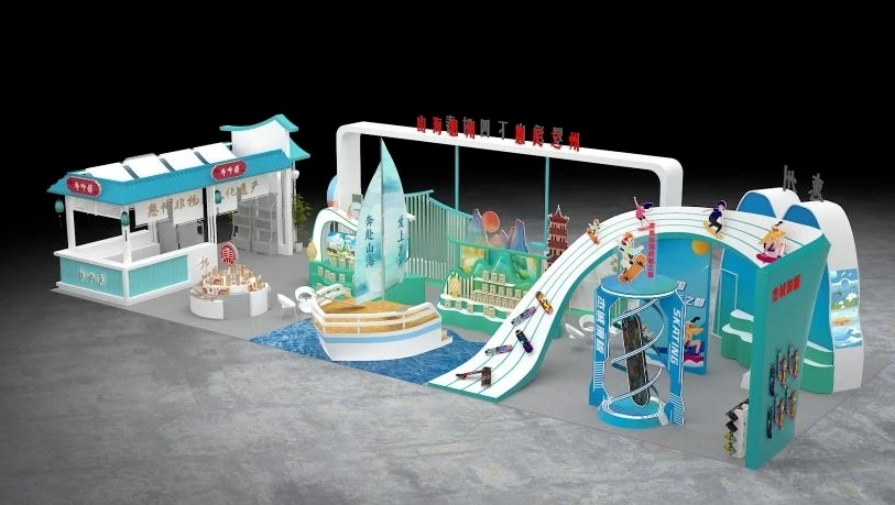 展臺主體結構為“游輪”與滑板賽道創意,新穎獨特且具視覺沖擊效果;設計的滑板體驗區使整個展臺更加靈動而流暢,凸顯文旅體融合發展的主題;中心地面以藍色海洋發光地面為亮點,科技、時尚,契合惠州獨有的海洋優勢。