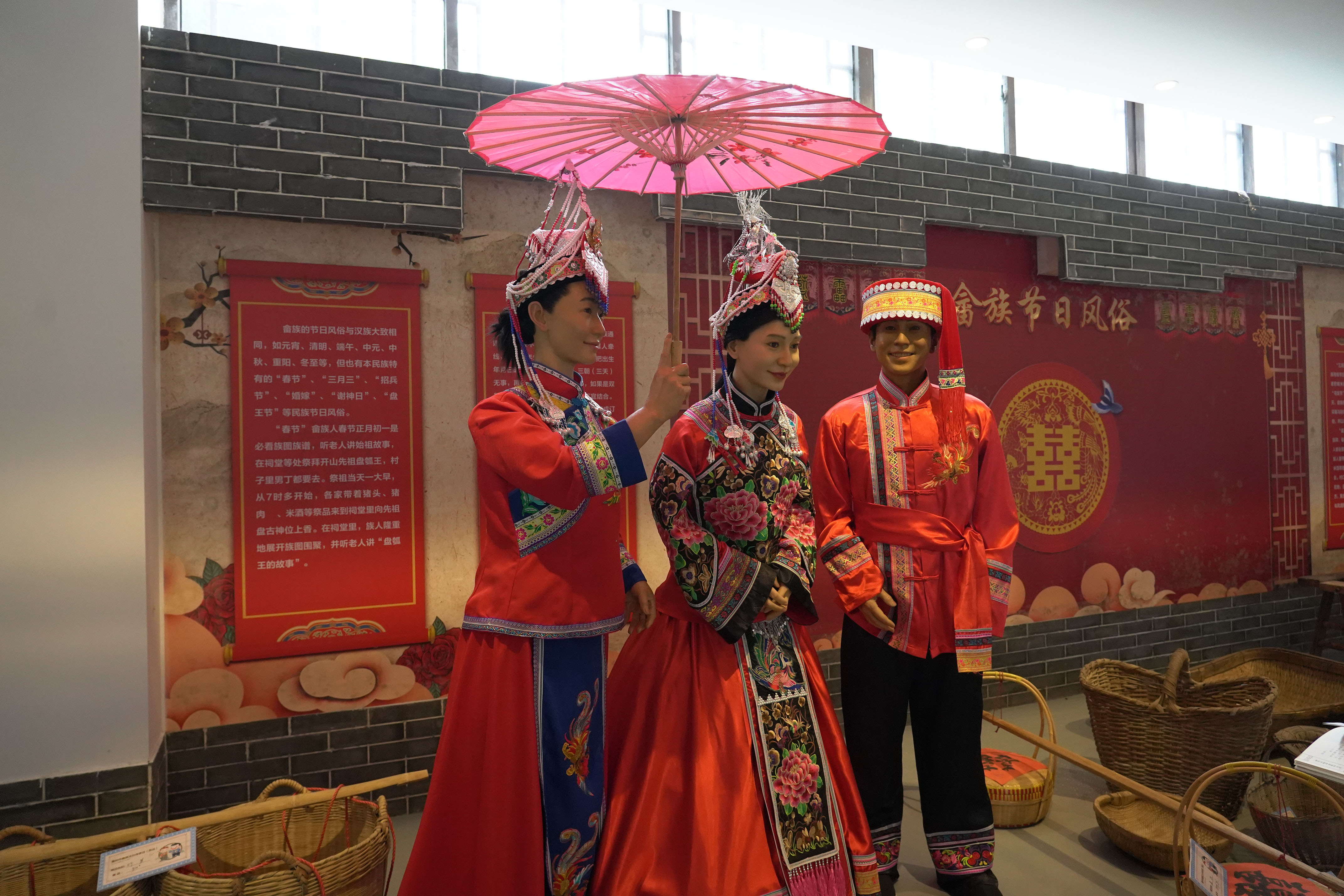 文化傳承館一樓墻面展板旁,穿著畬族新娘新郎和伴娘服飾的3個人體模型笑容滿面,喜慶氛圍感拉滿。“新郎”還用扁擔挑著裝滿米和酒的籮格迎親,寓意未來婚姻生活細水長流。