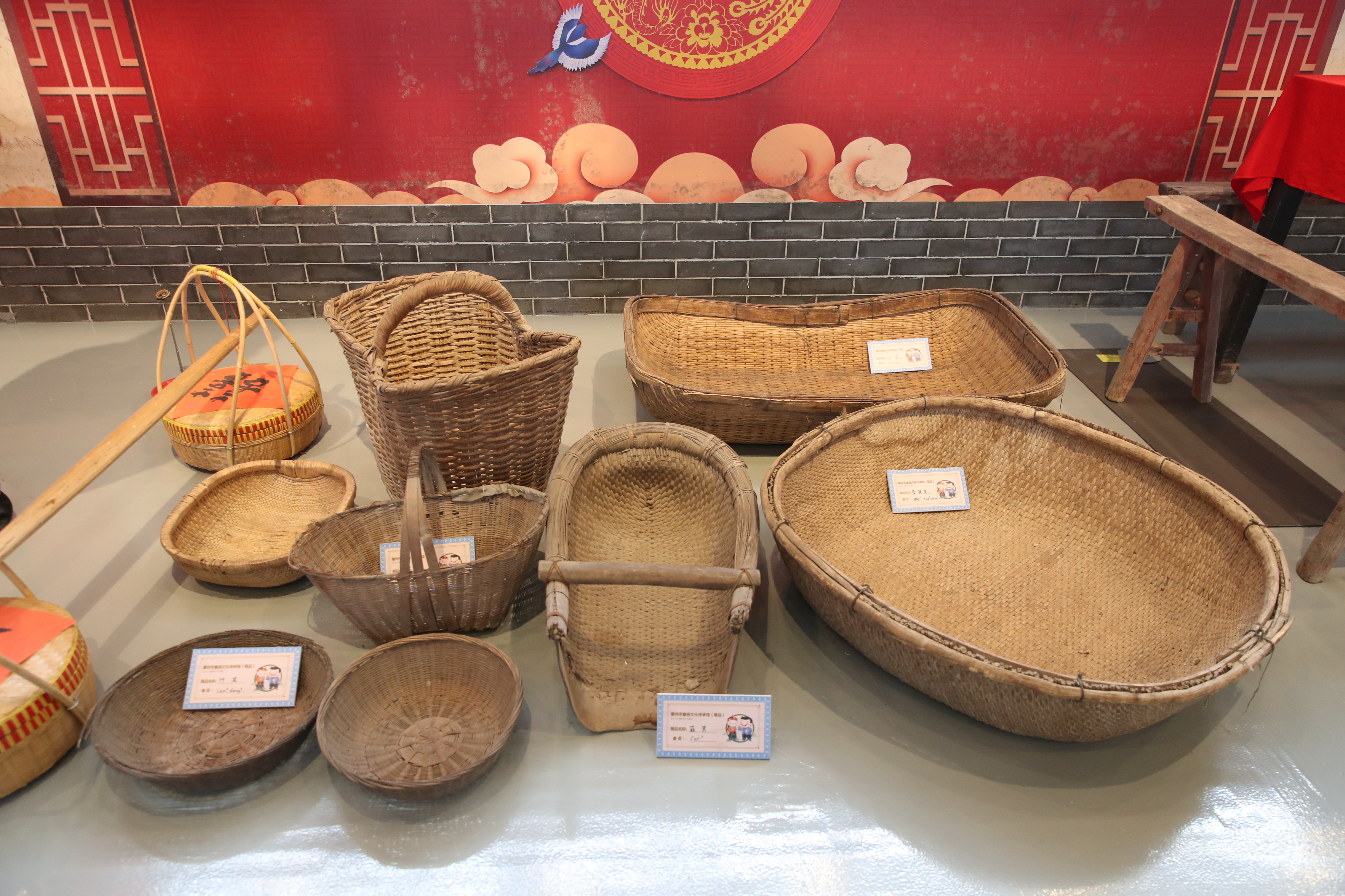 畬族文化傳承館二樓展示了從村里各家各戶收集而來的“老物件”,有竹籃、簸箕、鋤頭、秧鏟、鐵耙、禾叉等,真實還原畬族人磨稻谷等勞作場景。