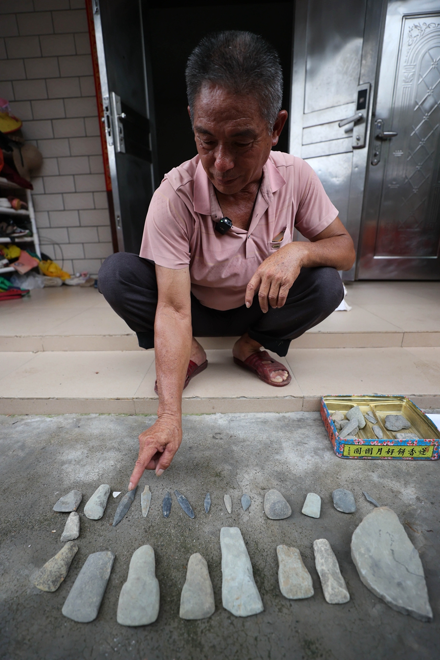 村民呂順才三十多年來從平海舂碓石遺址陸續撿到的石鏃、石錛、石斧、石環等石器。本版圖片 惠州日報記者楊建業 羅劍業 攝
