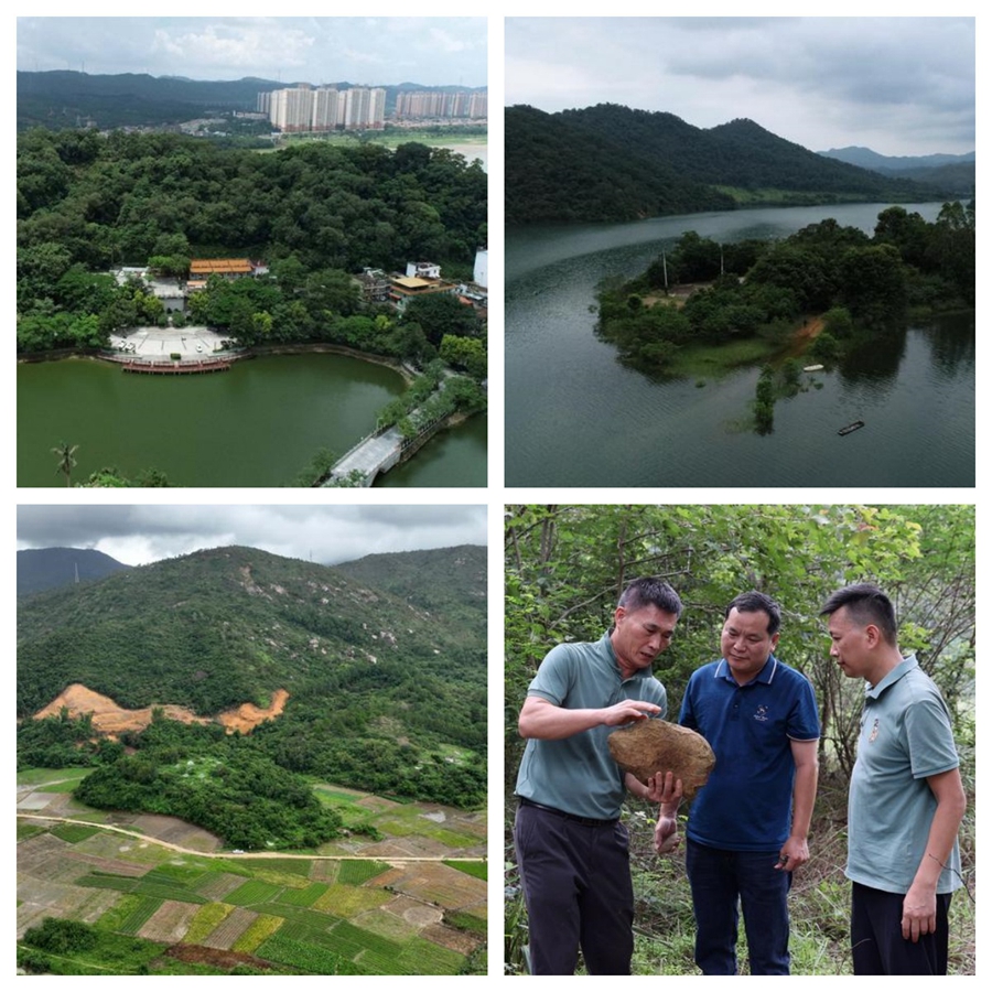 左上:葫蘆嶺貝丘遺址 右上:水東陂水庫 左下:平海舂碓石遺址 右下:在水東陂林場發現疑似“砍砸器”的石頭。