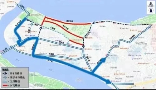 (二)濱江東路/黃家塘街交叉口至濱江東路/東江沙路交叉口路段,調(diào)整為車輛東往西單向通行。