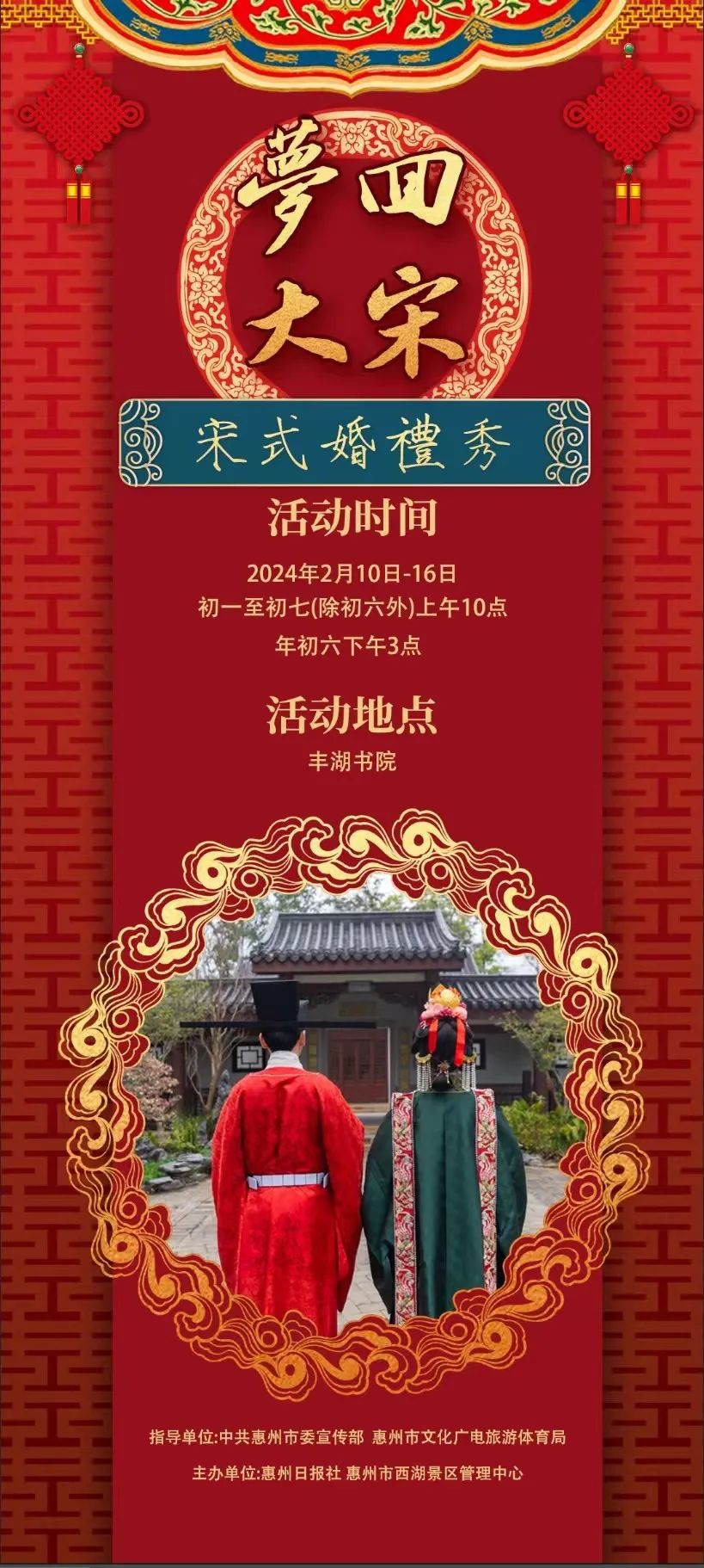 “羅浮山下四時春”——嶺南書院·豐湖書院春節主題活動,將于2月10日-2月16日(正月初一至初七)在惠州西湖景區豐湖書院舉辦。本次主題活動分為“宋式婚禮”“宋街”兩大板塊,帶你一起夢回大宋,在“穿越之旅”中沉浸式體驗千年前的北宋盛況。