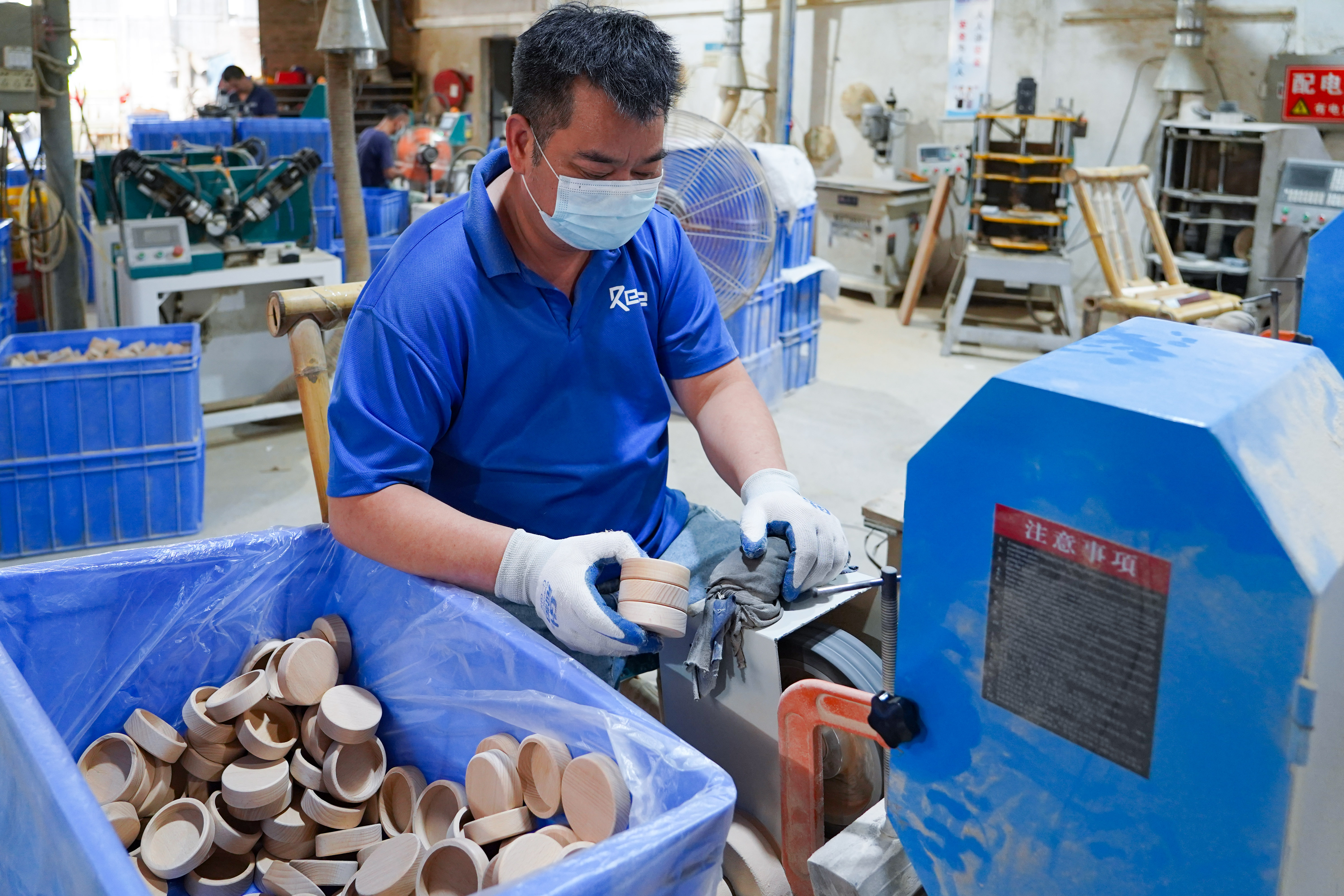 “從1994年開設工廠至今,還沒有遇到過因為沒訂單需要停工的情況。”從業30年,龍潭鎮木制品行業協會會長葉雨波對行業的發展充滿信心。龍潭的木制品不愁銷路,一方面是因為這一行業的市場廣闊。木制產品涉及日常生活的方方面面,從瓶蓋、桌腿、衣托、門把手、刀柄,到各類廚具、家具,處處都有木制品的“身影”。相較于塑料,木頭更具厚重感和層次感,近年來,不少奢侈品也開始頻繁使用木制配件,市場需求量越來越大。另一方面則是產品的全面“觸網”。2010年前后,在當地政府的大力推動下,竹木制品加工企業開始通過電商平臺推銷產品,行業迎來飛速發展時期。線下生產、線上銷售的經營模式讓龍潭竹木制品行業發生了“蛻變”,產品銷路進一步拓寬。