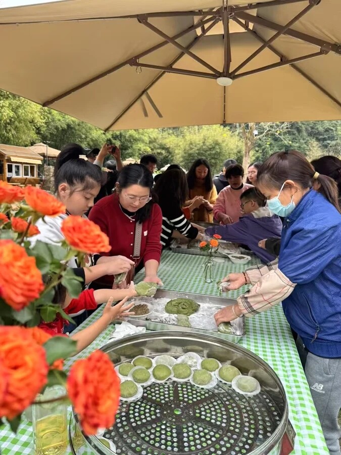 在惠州鄉村里,游客們興趣盎然學做清明時令小吃艾粄;葜萑請笥浾咦T琳 攝