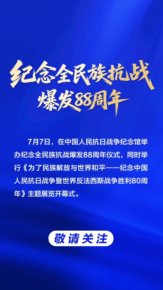 據“中國人民抗日戰爭紀念館”微信公眾號消息,7月7日,在中國人民抗日戰爭紀念館舉辦紀念全民族抗戰爆發88周年儀式,同時舉行《為了民族解放與世界和平——紀念中國人民抗日戰爭暨世界反法西斯戰爭勝利80周年》主題展覽開幕式。