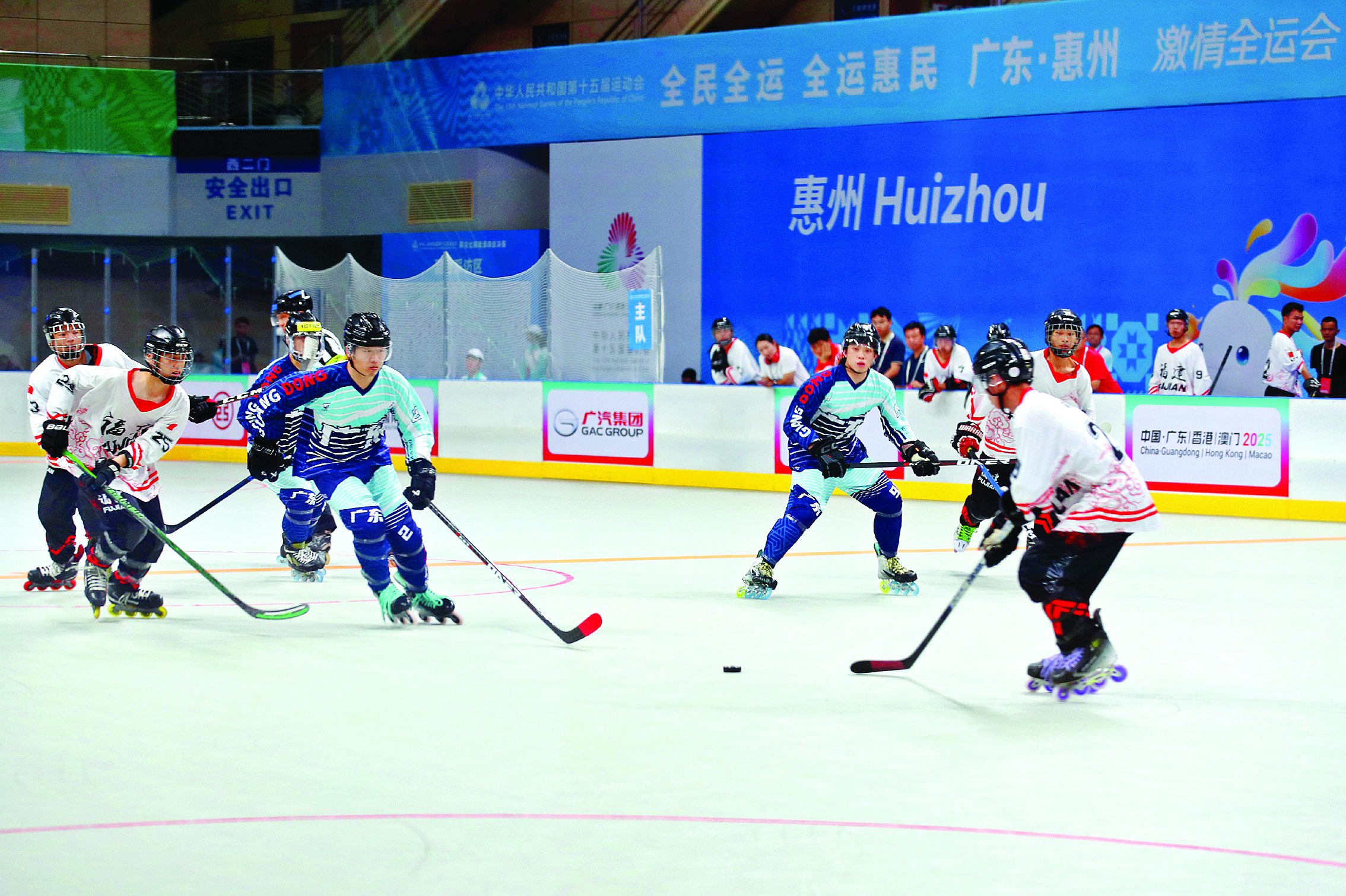 10月15日晚,第十五屆全運會單排輪滑球項目決賽男子組小組賽,廣東隊(藍衣)13:1戰勝福建隊(白衣)。 惠州日報記者鐘暢新 攝
