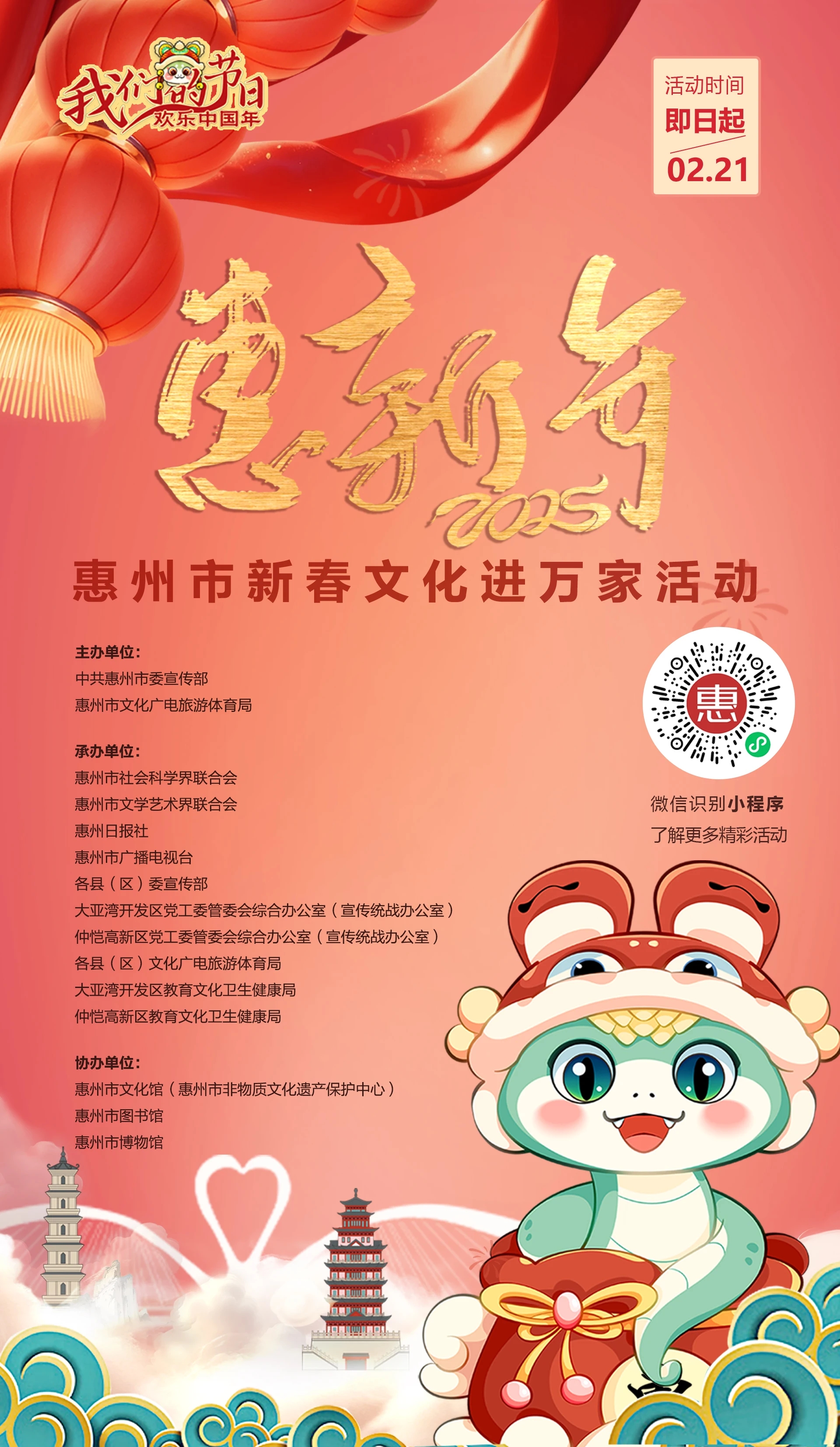 本次活動由中共惠州市委宣傳部、惠州市文化廣電旅游體育局主辦,旨在積極推動文化傳承發展和繁榮興盛,深入實施2025年“我們的中國夢——文化進萬家”活動,以形式多樣的文化活動營造歡樂吉祥、溫暖和順的濃厚節日氛圍。