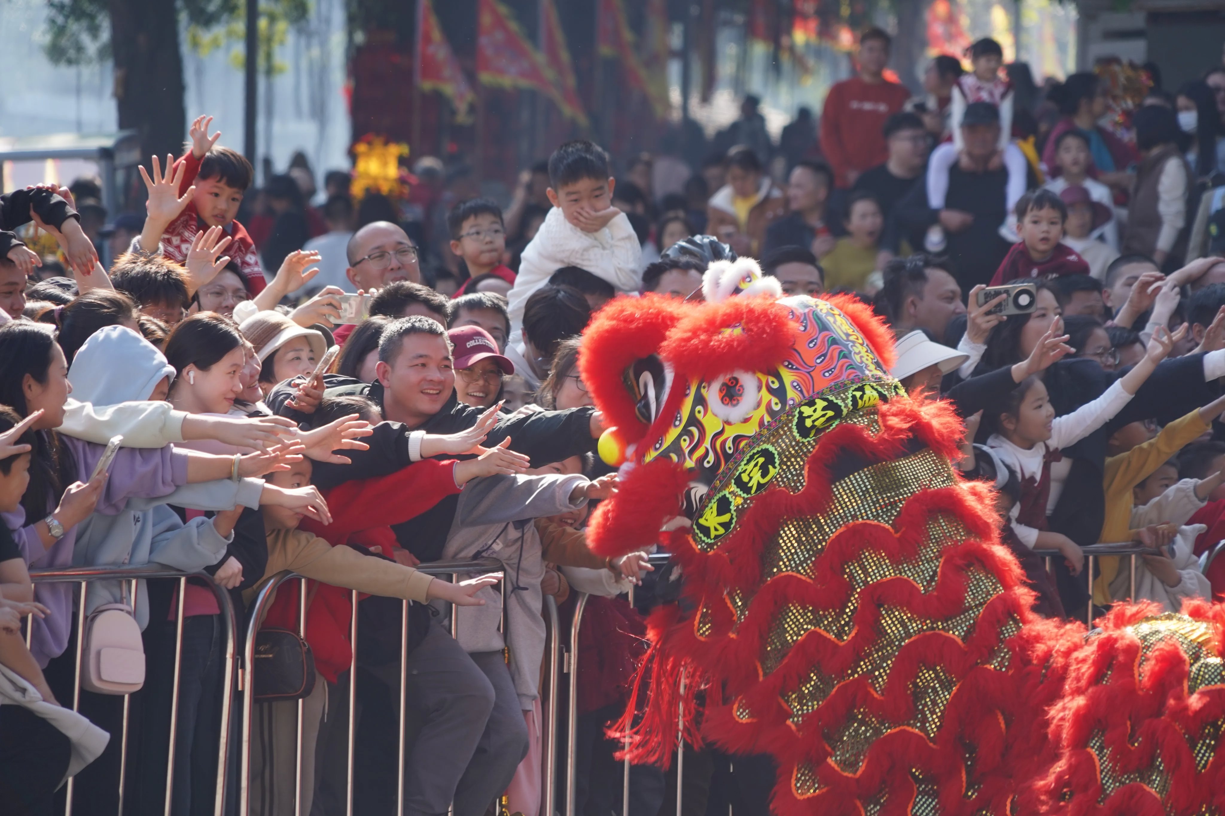 羅浮山景區(qū)醒獅與游人互動(dòng)。
