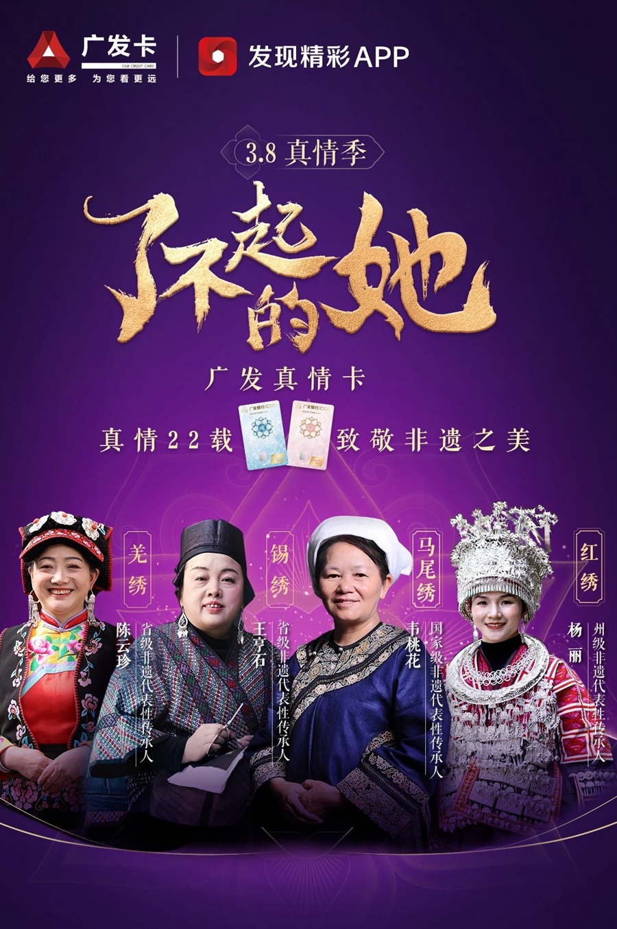 廣發真情卡攜手“天才媽媽”,將馬尾繡、羌繡、紅繡、錫繡四種非遺技藝傳承人的故事帶入到大眾視野,通過故事、人物、作品傳遞非遺文化的意蘊,呈現她們身上傳承、熱愛、自信、堅持等珍貴的品質,展現女性力量。一支“了不起的她”紀錄片走進非遺傳承人的生活環境,用鏡頭記錄、細致地展現出馬尾繡、羌繡、紅繡、錫繡非遺傳承人的真實故事、技藝及背后蘊含的民族文化,經由韋桃花、陳云珍、王亨石、楊麗、潘正永五位傳承人娓娓道來的講述,真情致敬非遺之美,致敬每一位“了不起”的她。