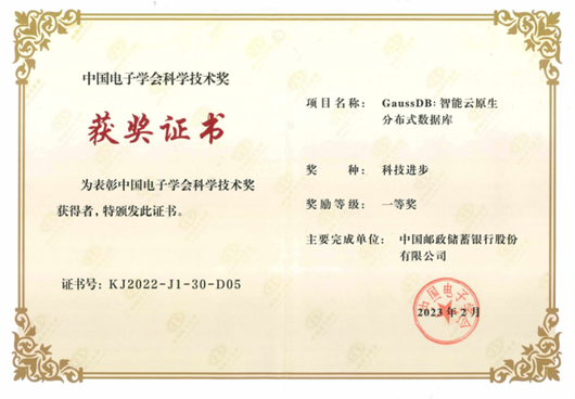 近日,在2022年中國電子學會科學技術獎的評選中,中國郵政儲蓄銀行憑借高斯數據庫(GaussDB)在新一代個人業務核心系統的全面應用與深度聯合創新,榮獲中國電子學會科學技術獎科技進步一等獎。