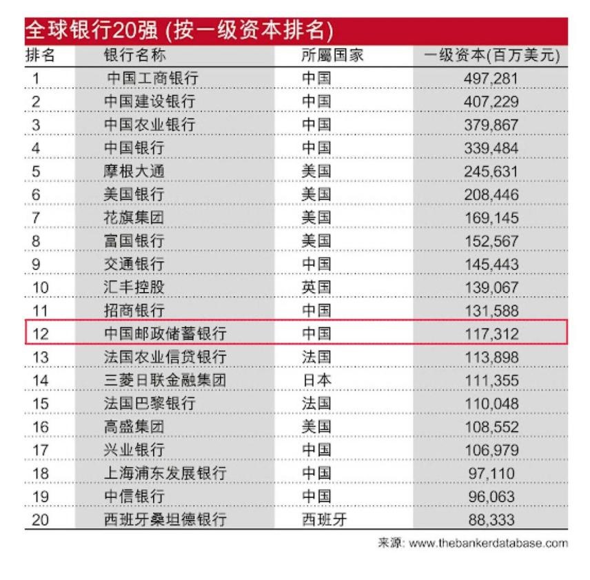 第12位!郵儲銀行在“全球銀行1000強”排名再攀新高
