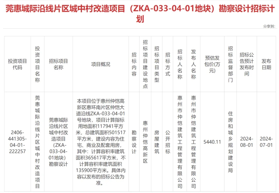 7月1日,據惠州市公共資源交易中心信息,莞惠城際沿線片區城中村改造項目(ZKA-033-04-01地塊)發布施工招標,預計發包價為178627.77萬元。