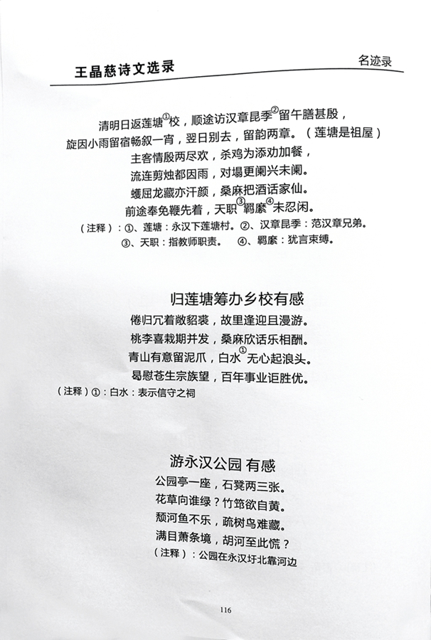 多年來,在永漢蓮塘,很多年輕一代“常聽老人們提到文人王晶慈的名字”。王晶慈的事跡,經過后人收集、整理,先后見載于《龍門文史》(1986年)、《龍門縣志》(1995年)。后人將王偉卿、王晶慈、王一洲三代人的詩歌編為《怡廬詩集》,留下一份珍貴的文獻資料。《龍門縣麻榨約坑永漢蓮塘云鸞裔王氏族譜》(2020年)亦收錄王晶慈詩作若干,這些詩篇傳承的不僅是文化,更是一種民族精神。