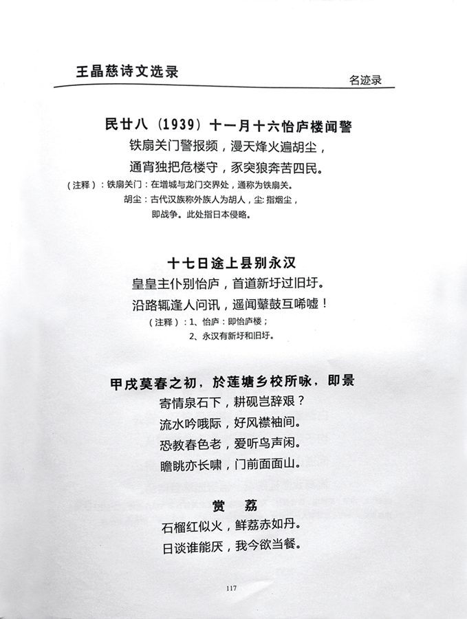 當時,王晶慈以詩歌言“家國情懷”,寫下流離顛沛的“詩史”。在《民廿八十一月十六怡廬樓聞警》,他寫道“鐵扇關門警報頻,漫天烽火遍胡塵,通宵獨把危樓守,豕突狼奔苦四民”。鐵扇關門在增城與龍門交界處,怡廬樓為王晶慈在永漢圩住所。在次日的詩歌《十七日途上縣別永漢》中,他寫道“倉皇主仆別怡廬,首道新圩過舊圩。沿路輒逢人問訊,遙聞鼙鼓互唏噓”。隨后,在《二十日詠于縣城邸》詩中,驚魂未定的王晶慈說,“鄉云籠罩戰云中,頻見飛機屢襲空。骨肉流離蓮梗斷,七星岡里叩蒼穹。”