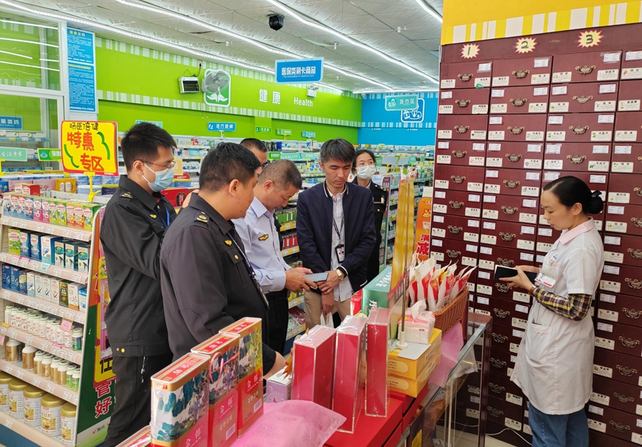 惠州市市場監督管理局與惠城區市場監督管理局執法人員對藥店開展專項檢查。東江圖片社供圖