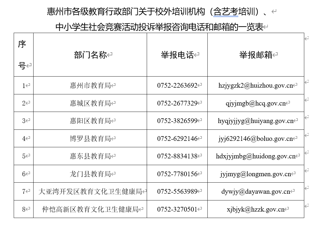 8月29日,惠州市教育局發(fā)布《關(guān)于公布惠州市中小學(xué)生校外培訓(xùn)(含藝考培訓(xùn))、中小學(xué)生社會(huì)競(jìng)賽活動(dòng)投訴舉報(bào)咨詢電話和郵箱的公告》,凡是涉及校外培訓(xùn)機(jī)構(gòu)(含藝考培訓(xùn))資質(zhì)、課程、師資、招生、收費(fèi)、侵害未成年人身心健康等方面問(wèn)題,以及面向中小學(xué)生的各類(lèi)社會(huì)競(jìng)賽活動(dòng)問(wèn)題都可以舉報(bào)。