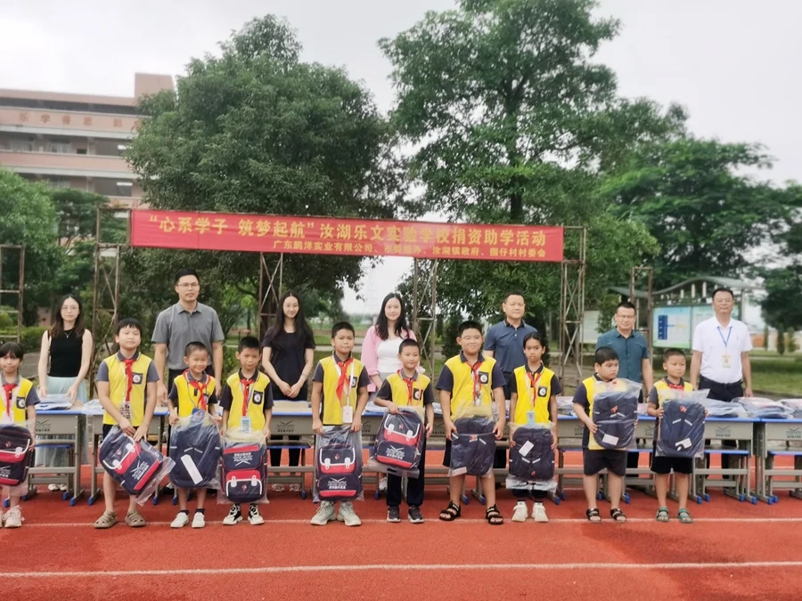 愛心企業(yè)廣東鵬洋實業(yè)有限公司向惠城區(qū)汝湖樂文實驗學(xué)校捐贈100套書桌、430個書包。