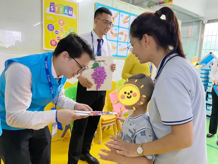 惠心特殊兒童關(guān)愛中心的特殊兒童在老師引導(dǎo)下向愛心企業(yè)志愿者贈送手工畫。