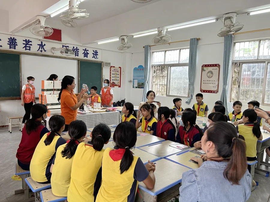 志愿者與水口街道鹿崗小學(xué)師生互動玩游戲。