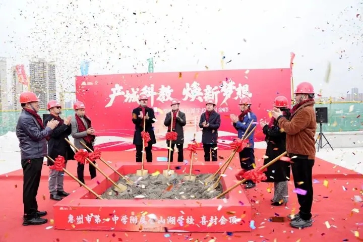 隨著最后一方混凝土澆筑完成,位于惠州天安數(shù)碼城的惠州一中附屬金山湖學(xué)校主體大樓正式封頂,離9月正式開學(xué)的日子也越來越近了。