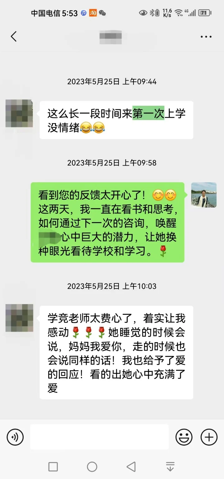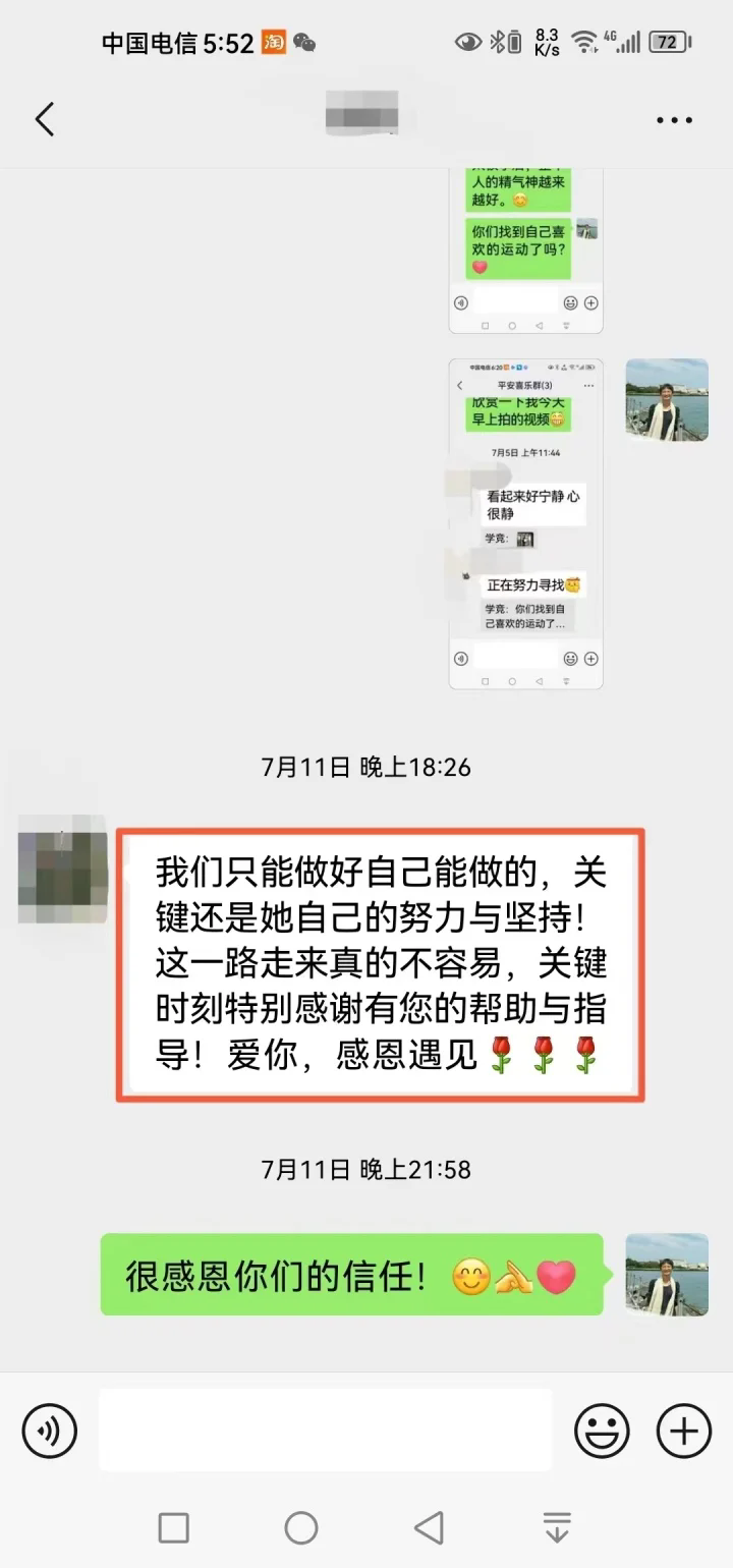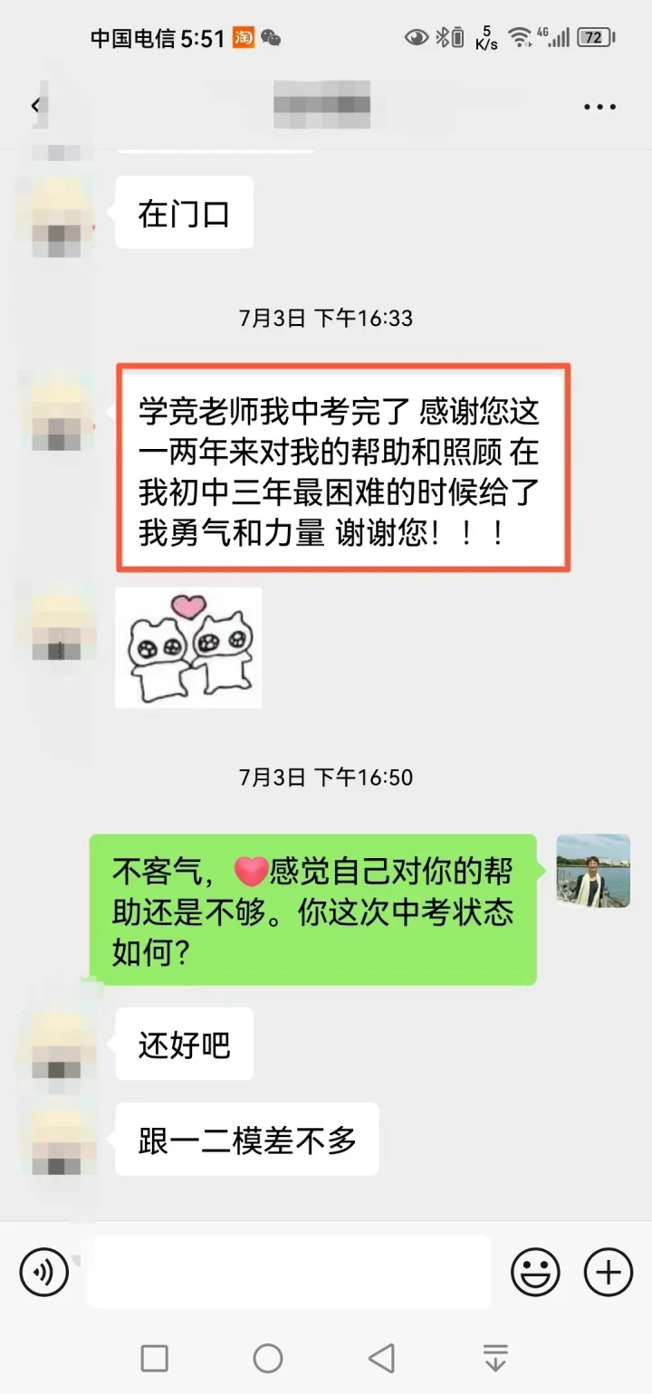 去年12月后,學競因為工作很忙,讓沁和沁媽去自我成長,她們一直努力向前走著。不久前中考結束后,就有了文章開頭的一幕。當學競肯定了沁媽的付出后,沁媽回復道:“我們只能做好自己能做的,關鍵還是她自己的努力與堅持!這一路走來真的不容易,關鍵時刻特別感謝有您的幫助與指導!愛你,感恩遇見!”