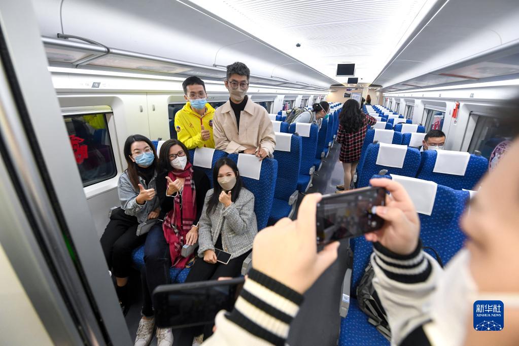 1月15日,在深圳北站,搭乘恢復通車后內地駛往香港首趟列車G5607次的乘客在車廂里留影。新華社記者 毛思倩 攝