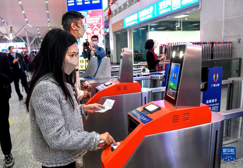 1月15日,在深圳北站,搭乘恢復通車后內地駛往香港首趟列車G5607次的乘客通過閘機進站。新華社記者 毛思倩 攝