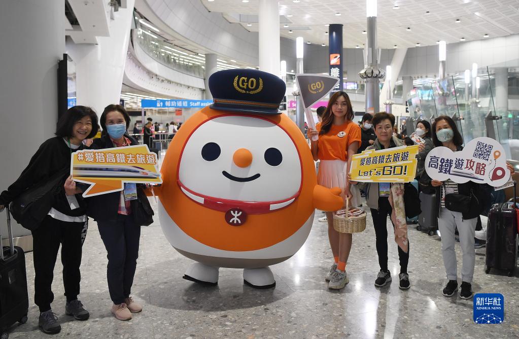 4月1日,在香港高鐵西九龍站,旅客與高鐵吉祥物“高鐵隊長”合影。新華社記者陳鐸攝