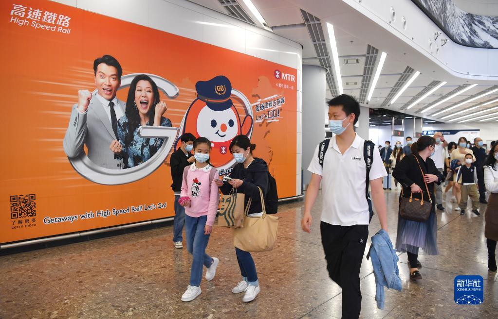 4月1日,從內地搭乘跨省長途列車抵港的旅客走出香港高鐵西九龍站。新華社記者陳鐸攝