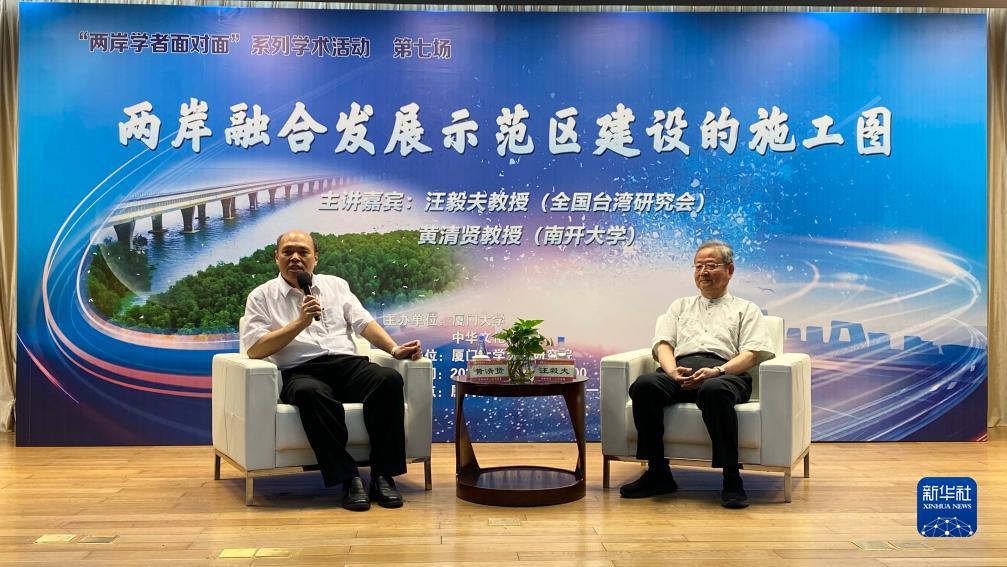9月26日,全國臺灣研究會會長汪毅夫與南開大學(xué)周恩來政府管理學(xué)院行政管理系教授黃清賢以“兩岸融合發(fā)展示范區(qū)建設(shè)的施工圖”為主題在廈門大學(xué)開展對談。新華社記者 顏之宏 攝