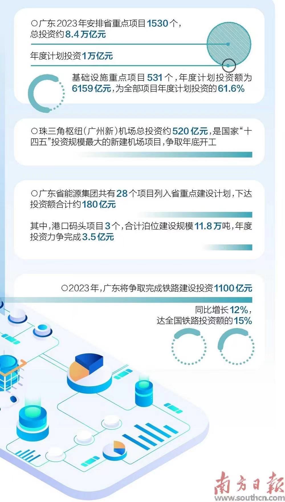 經濟第一大省廣東在全省高質量發展大會特別設置了“狠抓重點項目、重大平臺建設,全力推動有效投資落地落實”分會場。會上,廣東公布,2023年全省共安排省重點項目1530個,總投資8.4萬億元,年度計劃投資1萬億元。其中,基礎設施重點項目531個,年度計劃投資額為6159億元,為全部項目年度計劃投資的61.6%。