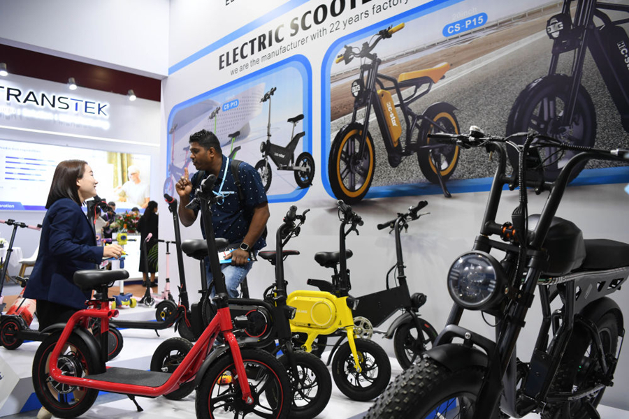 4月15日,采購商(右)和電動自行車參展商在廣交會上交流。新華社記者 鄧華 攝