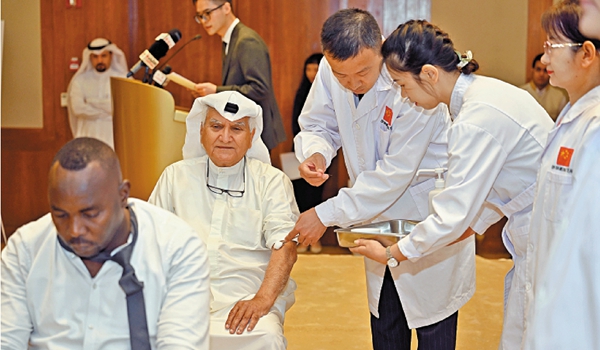 9月11日,在科威特大穆巴拉克省,中國援科威特醫療隊隊員展示中醫針灸。目前中醫藥已推廣至196個國家和地區。(圖/新華社)