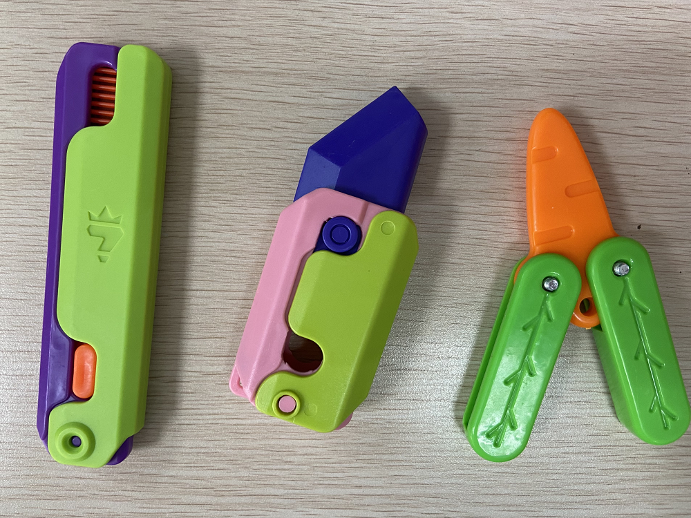 別看“蘿卜刀”肉肉墩墩、胖胖乎乎的,刀頭也是軟塑料制造的,直接傷害力不強,但是,它卻是不折不扣地還原了管制刀具——彈簧刀(跳刀)——的結構:可以單手操作彈出“刀刃”,并且鎖定“刀刃”,還能發出機械結構碰撞的“啪嗒”聲。