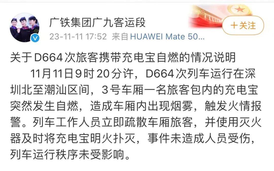 3號車廂一名旅客包內的充電寶突然發生自燃