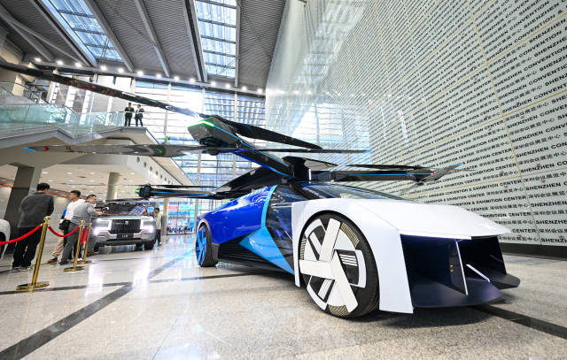 11月15日,在第二十五屆高交會上,搭載了人工智能大模型系統(tǒng)的小鵬匯天陸空一體式飛行汽車對公眾展出。新華社發(fā)