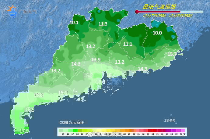 7日,全省大部晴天,早晨部分市縣有(輕)霧。最低氣溫:粵北和珠江三角洲北部市縣7~11℃,珠江口附近和粵西市縣14~17℃,其余市縣11~14℃。