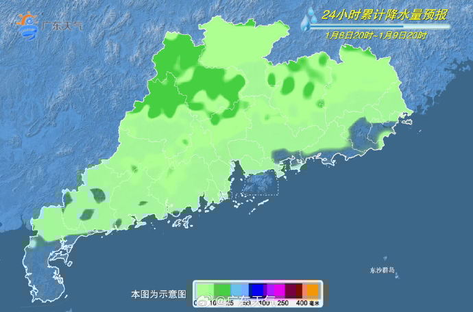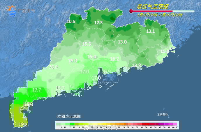 9日,中北部市縣多云到陰天,有小到中雨局部大雨,其余市縣多云間陰天,有分散小雨。早晨最低氣溫:粵北和粵東市縣10℃~13℃,珠江口附近和粵西市縣17℃~20℃,其余市縣14℃~16℃。