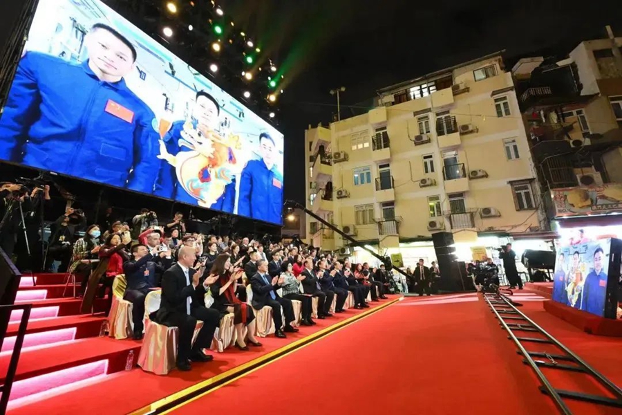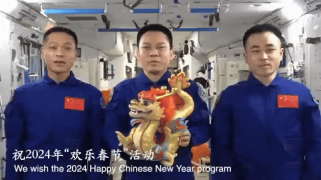 啟動儀式前,駐守在中國空間站的航天員手持“歡樂春節”吉祥龍,通過視頻方式向現場觀眾和全球華人送上來自“天宮”的龍年新春祝福。