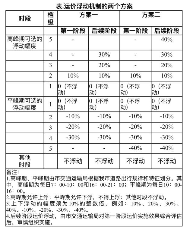 浮動幅度方面,按高峰期、平峰期可選擇運價浮動幅度的大小,提出2個具體方案,并分階段實施,逐步擴大浮動幅度。