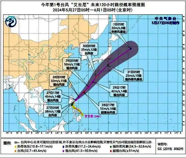 今年第1號臺風“艾云尼”已于5月26日晚上由強熱帶風暴級加強為臺風級,今天(5月27日)早晨5時其中心位于菲律賓馬尼拉東偏北方向約205公里的菲律賓東部近海海面上,就是北緯15.6度、東經122.6度,中心附近最大風力有13級(38米/秒),中心最低氣壓965百帕,七級風圈半徑100~150公里,十級風圈半徑50~60公里,十二級風圈半徑30公里。