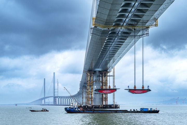 黃茅海大橋最后一片鋼箱梁吊裝現場。(廣東省交通集團供圖 )