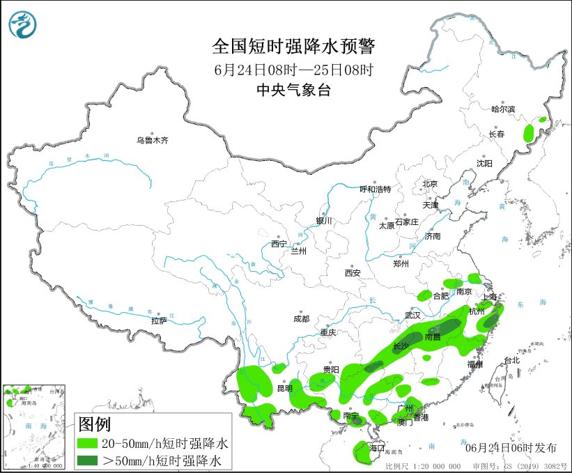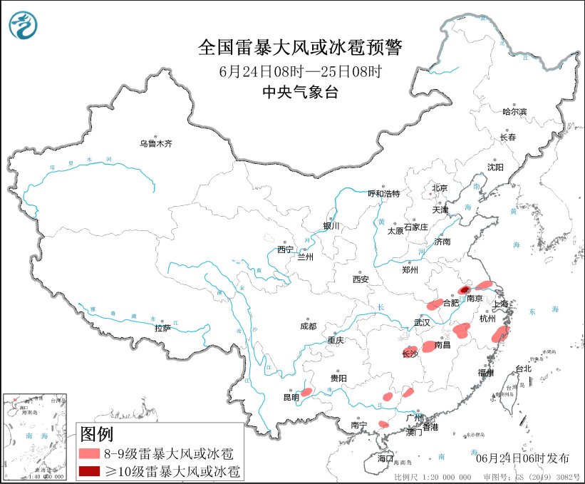 據中央氣象臺網站消息,預計6月24日8時至25日8時,安徽中部、江蘇中南部、湖北東北部、湖南中部、江西中北部、浙江東南部、云南東北部、廣西東部、廣東北部等地的部分地區將有8級以上雷暴大風或冰雹天氣,其中,安徽中部局地將有10級以上雷暴大風,最大風力可達11級以上;吉林東部、安徽中南部、江蘇中南部、湖南中南部、江西中北部、浙江、福建北部、貴州南部、云南中西部和東南部、廣西、廣東中西部、海南島西部等地的部分地區將有小時雨量大于20毫米的短時強降水天氣,其中,湖南東部和西南部、江西中北部、浙江東部、廣西東北部和南部等地的部分地區小時雨量大于50毫米,最大可達70毫米以上。中央氣象臺6月24日6時繼續發布強對流天氣藍色預警。