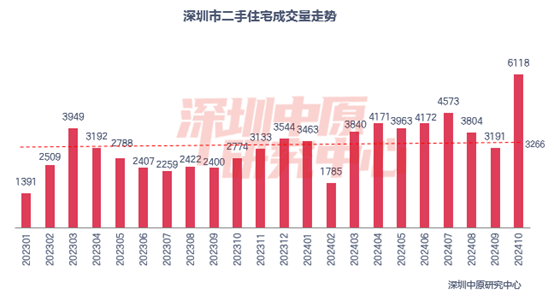 10月,深圳全市二手住宅過戶6118套,環比上升91.7%;成交57.4萬㎡,環比上升86.0%,創近43個月新高,也是2021年3月以后首次突破5000套。