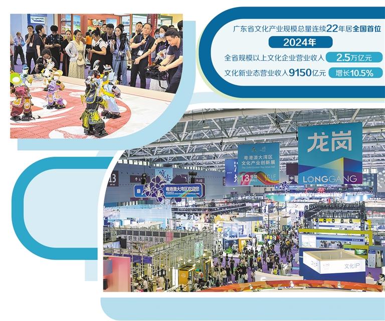 作為我國文化產業第一大省,廣東省文化產業規模總量連續22年居全國首位。2024年,全省規模以上文化企業營業收入2.5萬億元,約占全國六分之一;文化領域新質生產力不斷壯大,文化新業態營業收入9150億元,增長10.5%,在數字創意、動漫游戲、網絡視聽、數字文化制造等領域形成較強競爭優勢。