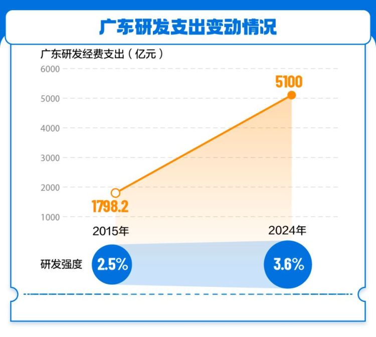 科技是第一生產力。面對新周期和新趨勢,廣東“重倉”科技創新激活發展動力,2024年全省研究與試驗發展(R&D)經費支出約5100億元,是2015年的2.8倍;研發投入強度為3.6%左右,已經超過日本、德國等制造強國的水平。