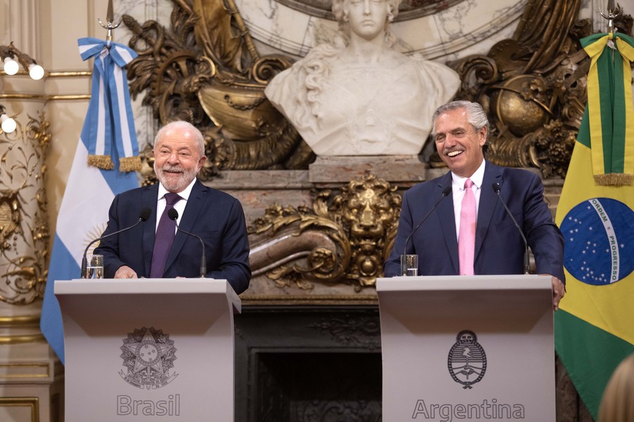 1月23日,在阿根廷布宜諾斯艾利斯,阿根廷總統費爾南德斯(右)和巴西總統盧拉在玫瑰宮出席新聞發布會。新華社發(馬丁·薩巴拉攝)