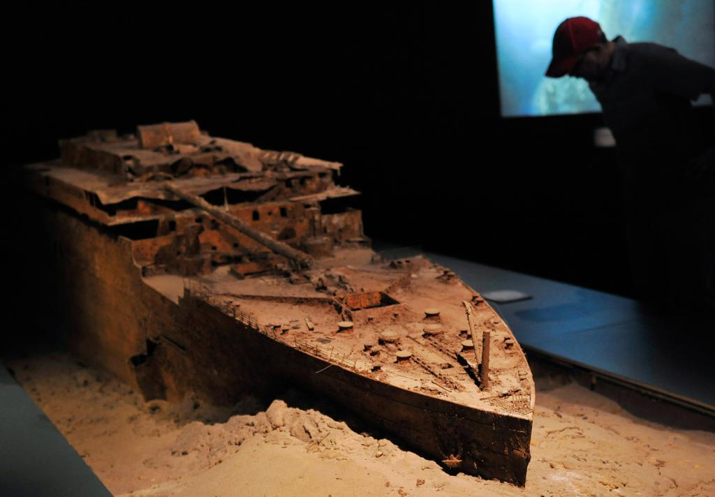 2012年4月5日,在美國首都華盛頓國家地理博物館舉行的“泰坦尼克”號(hào)沉船百年展上,人們觀看沉船殘骸模型。新華社記者王軼歐攝