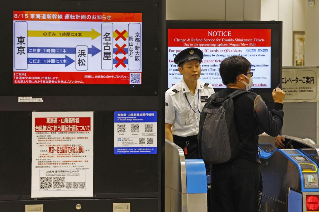 8月15日,日本東京站的電子告示牌顯示,受惡劣天氣影響,東海道新干線部分路段停運(yùn)。(新華社/共同社)